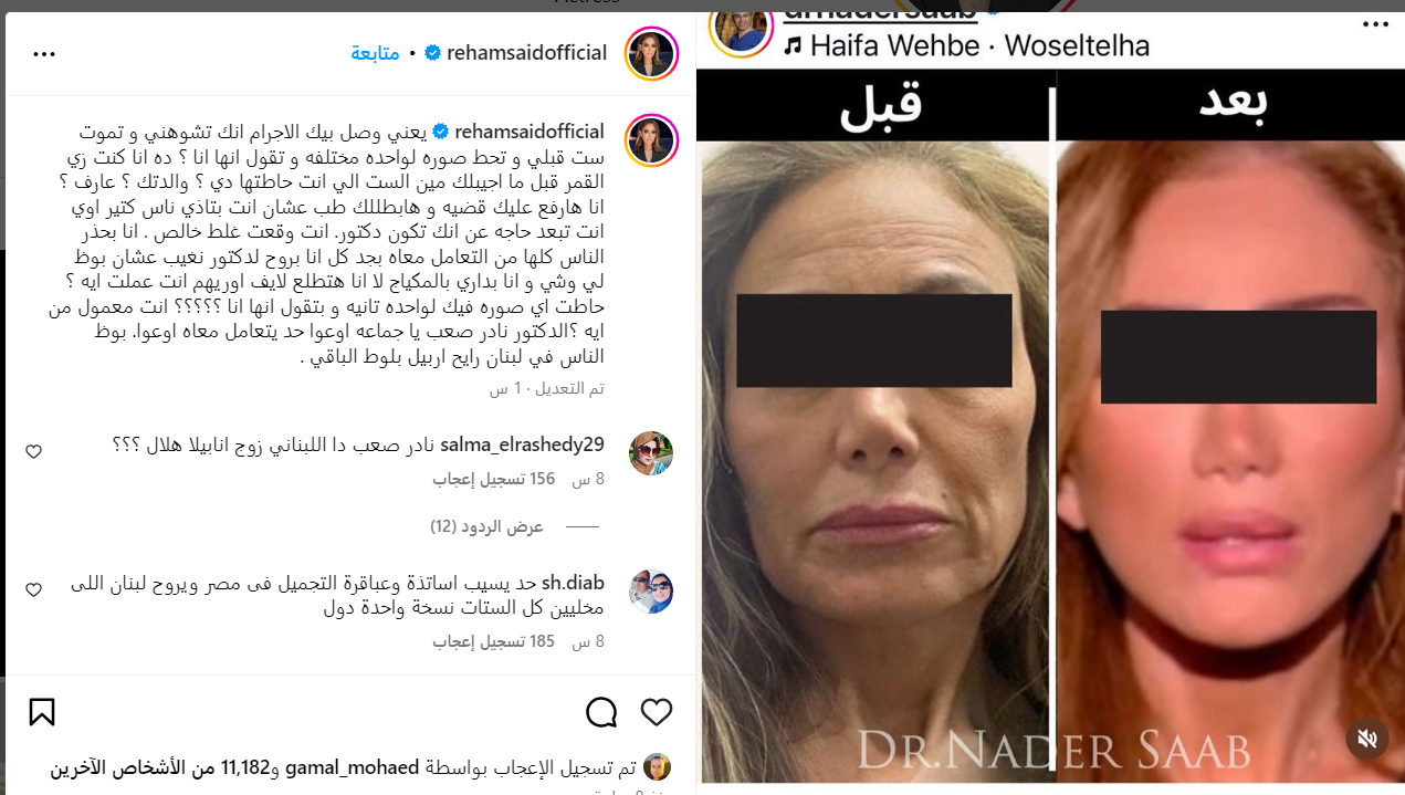 وعلقت ريهام سعيد على الصور: يعني وصل بيك الاجرام انك تشوهني وتموت 2 ستات قبلي وتحط صورة لواحده مختلفة وتقول إنه ا انا؟ ده انا كنت زي القمر قبل ما اجيلك مين المركوبة اللي انت حاطتها دي؟ والدتك؟ عارف؟ انا هرفع عليك قضية وهبطلك طب عشان انت بتأذي ناس كتير أو ي انت ابعد حاجة عن انك تكون دكتور.