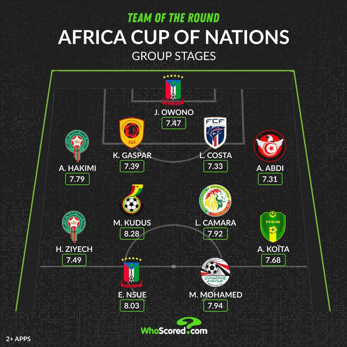 وتواجد بالتشكيل هداف البطولة إيميليو إنسوى مهاجم غينيا الاستوائية صاحب الـ5 أهداف، والنجم المغربي حكيم زياش والغاني محمد قدوس رغم خروج منتخب بلاده من دور المجموعات، وكذلك السنغالي لامين كامارا.