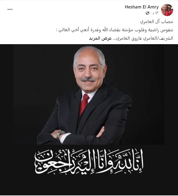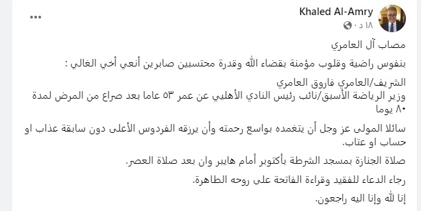 وقال "العامري" في منشور له عبر "فيس بوك": "بنفوس راضية وقلوب مؤمنة بقضاء الله وقدرة أنعي أخي الغالي: الشريف/العامري فاروق العامري، وزير الرياضة الأسبق ونائب رئيس النادي الأهلي، سائلا المولى عز وجل أن يتغمده بواسع رحمته وأن يرزقه الفردوس الأعلى دون سابقة عذاب أو حساب أو عتاب".