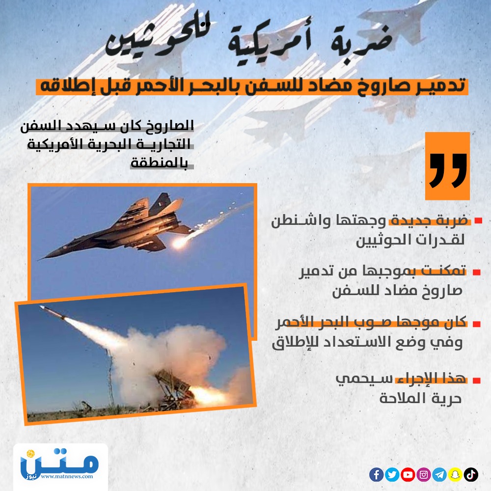 ضربة أمريكية للحوثيين.. تدمير صاروخ مضاد للسفن بالبحر الأحمر قبل إطلاقه (انفوجراف)