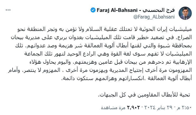وأضاف البحسني في منشور عبر منصة أكس: تلك الميليشيات لا تفهم سوى لغة القوة وهي الرادع الوحيد لتهور تلك الجماعة الإرهابية تم دحرهم من بيحان قبل عامين وهزيمتهم.