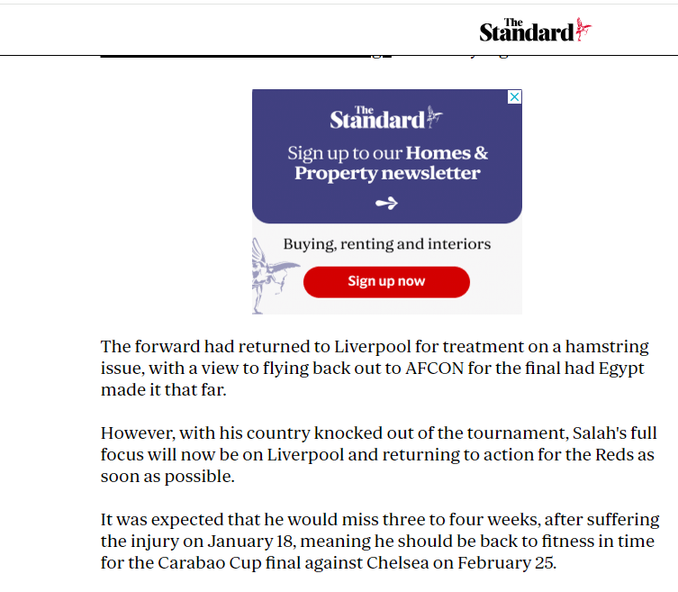 وذكر موقع "ستاندارد الإنجليزي"، أن محمد صلاح سيكون جاهزا للمشاركة في لقاء ليفربول أمام تشيلسي، والمقرر إقامته يوم 25 فبراير المقبل، في نهائي كأس كاراباو (كابيتال وان).