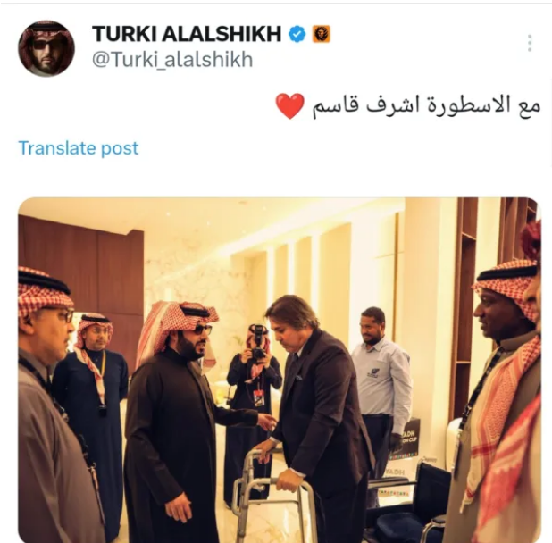 نشر المستشار تركي الشيخ رئيس هيئة الترفيه، صورة له عبر صفحته الشخصية على موقع التواصل الاجتماعى فيس بوك، مع اشرف قاسم.