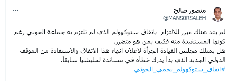 منصور صالح: لم يعد هناك مبرر للالتزام باتفاق ستوكهولم الذي لم تلتزم به جماعة الحوثي