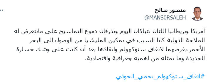 كما أضاف بأن أمريكا وبريطانيا اللتان تتباكان اليوم وتذرفان دموع التماسيح على ماتتعرض له الملاحة الدولية كانا السبب في تمكين المليشيا من الوصول إلى البحر الأحمر،بفرضهما لاتفاق ستوكهولم وانقاذها بعد أن كانت على وشك خسارة الحديدة وما تمثله من اهميه جغرافية واقتصادية.