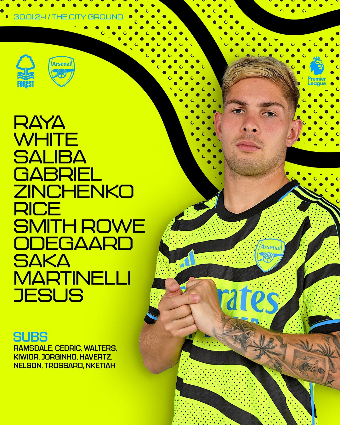 أعلن الإسباني ميكيل أرتيتا، المدير الفني لنادي أرسنال، التشكيل الرسمي للجانرز لمواجهة نظيره نوتينجهام فورست، مساء اليوم الثلاثاء، على ملعب "سيتي جراوند"، ضمن منافسات الجولة 22 من الدوري الإنجليزي.