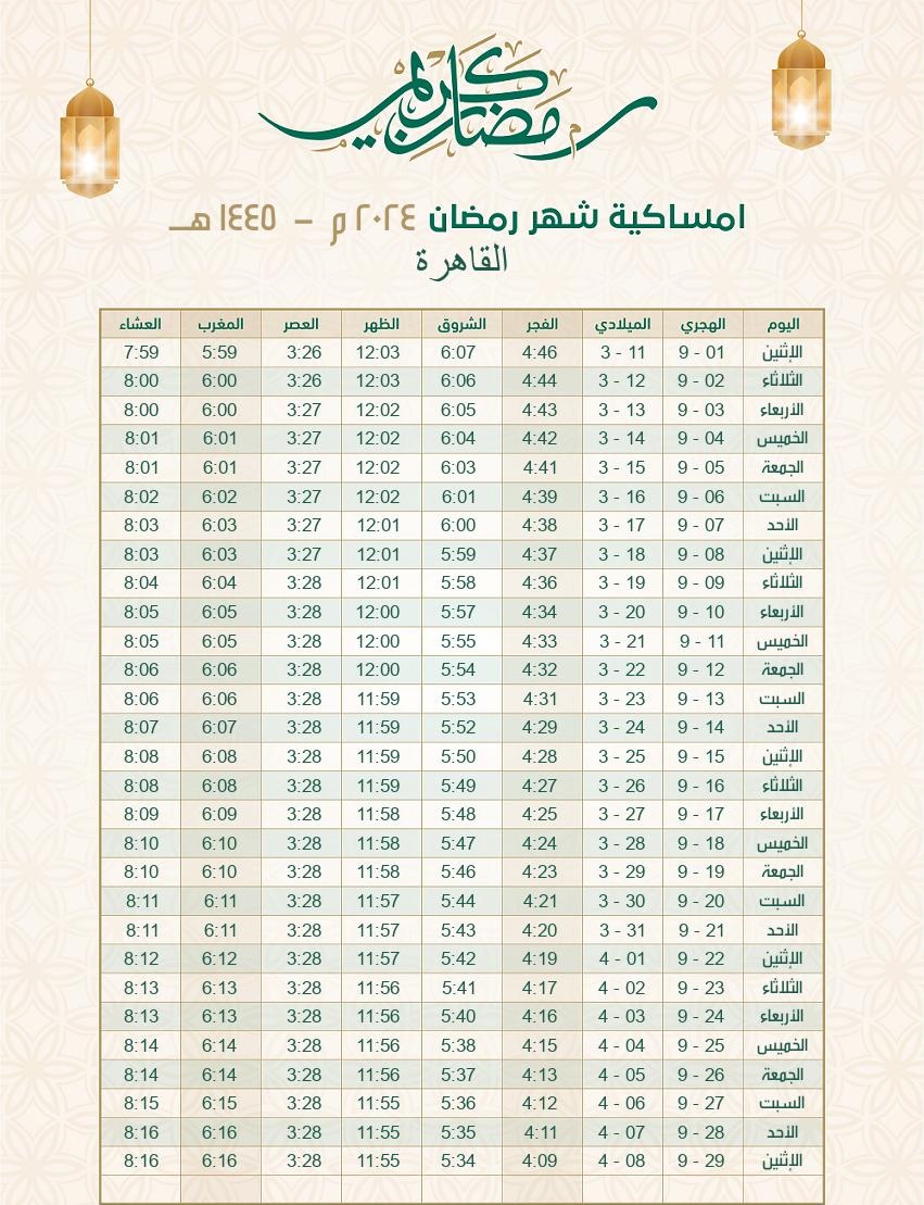 ومن إمساكية رمضان 2024، يمكن التعرف على عدد ساعات الصيام، وموعد أذان المغرب، وموعد أذان الفجر، وباقي مواقيت الصلاة، وهي نتيجة بالتقويم الهجري والميلادي لشهر رمضان، يمكن الحصول عليها ورقيا أو تحميلها إلكترونيا على الموبايل، ونوضح لكم منها عدد ساعات الصيام أول أيام رمضان كالتالي: