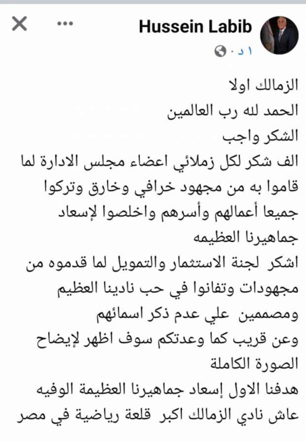 وواصل حسين لبيب: «أشكر لجنة الاستثمار والتمويل لما قدموه من مجهودات وتفانوا في حب نادينا العظيم ومصممين علي عدم ذكر أسمائهم وعن قريب كما وعدتكم سوف اظهر لإيضاح الصورة الكاملة».
