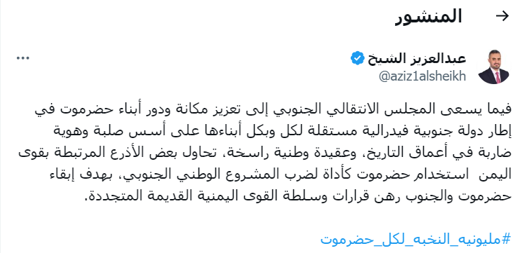 ولفت في تغريدة على منصة إكس إلى أنه بظل سعي المجلس تحاول بعض الأذرع المرتبطة بقوى اليمن استخدام حضرموت كأداة لضرب المشروع الوطني الجنوبي، بهدف إبقاء حضرموت والجنوب رهن قرارات وسلطة القوى اليمنية القديمة المتجددة".