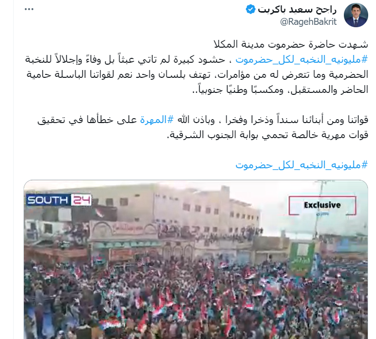 وأضاف باكريت: شهدت حاضرة حضرموت مدينة المكلا مليونية النخبة لكل حضرموت، حشود كبيرة لم تاتي عبثًا بل وفاءً وإجلالًا للنخبة الحضرمية وما تتعرض له من مؤامرات، تهتف بلسان واحد نعم لقواتنا الباسلة حامية الحاضر والمستقبل، ومكسبًا وطنيًا جنوبيًا.