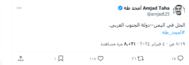 قال الخبير في الشؤون السياسية والاستراتيجية ورئيس المركز البريطاني لدراسات وأبحاث الشرق الأوسط أمجد طه، إن الحل في اليمن--دولة الجنوب العربي.