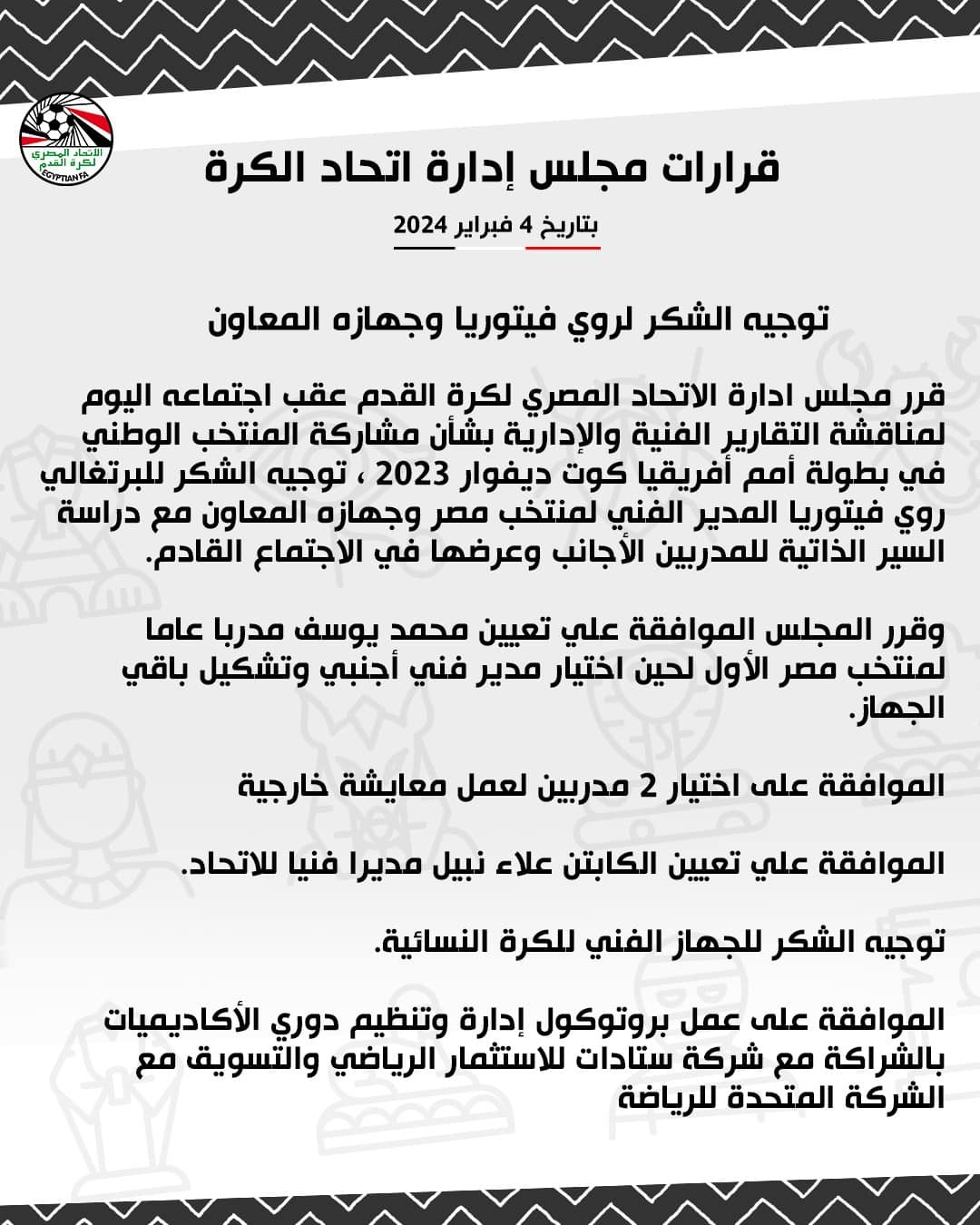 واستقر اتحاد الكرة على توجيه الشكر للبرتغالي روي فيتوريا المدير الفني لمنتخب مصر وجهازه المعاون، بعد الإخفاق في بطولة كأس أمم إفريقيا والخروج من دور الـ 16.