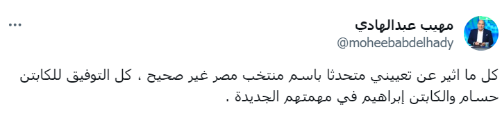 وكتب عبد الهادي على صفحته الرسمية بموقع التواصل الإجتماعي «أكس»: كل ما أثير عن تعييني متحدثا باسم منتخب مصر غير صحيح".