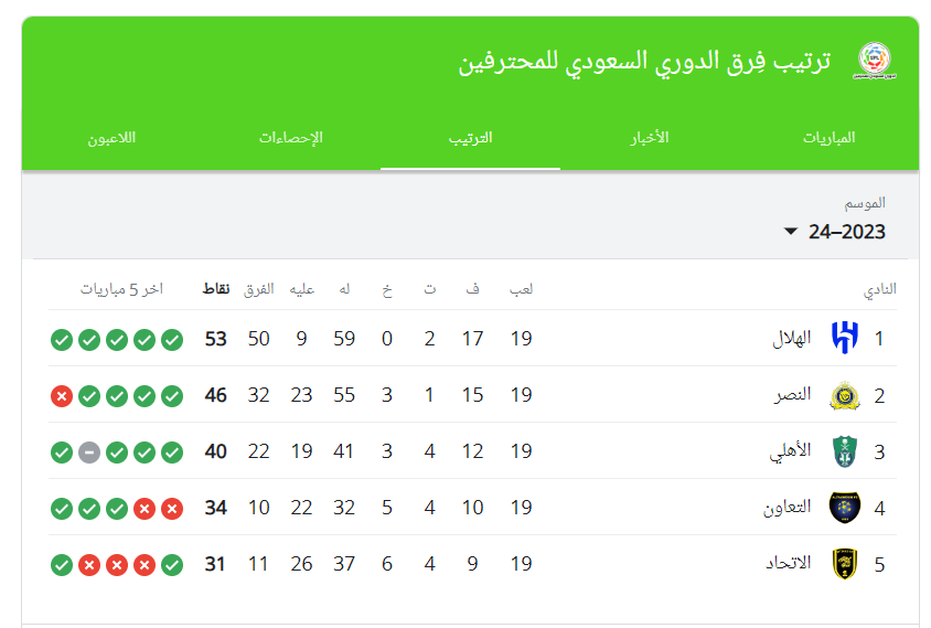ويتصدر فريق الهلال جدول ترتيب الدوري السعودي برصيد 53 نقطة، ويتواجد في الوصافة نظيره النصر بـ46 نقطة.