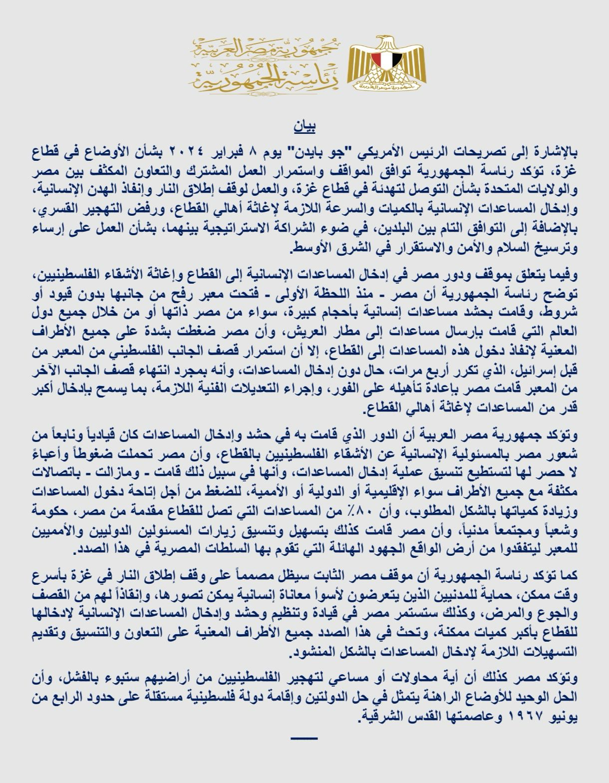 أصدرت الرئاسة المصرية، بيانا عاجلا بشأن تصريحات الرئيس الأمريكي "جو بايدن" يوم ۸ فبراير ۲۰۲٤ بشأن الأوضاع في قطاع غزة.