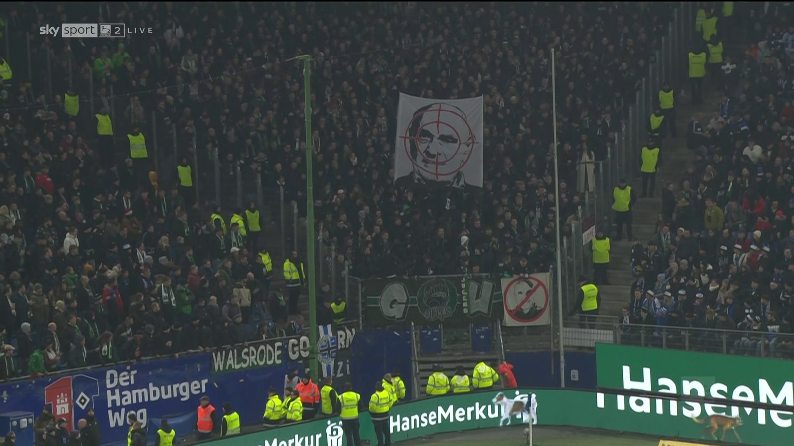ورفع المشجعون في نهاية المباراة لافتات تصور رئيس مجلس إدارة هانوفر مارتن كايند بين المرمى.