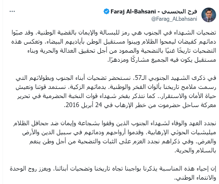 في يوم الشهيد الجنوبي.. البحسني: تضحيات الشهداء في الجنوب رمز للبسالة والإيمان بالقضية الوطنية