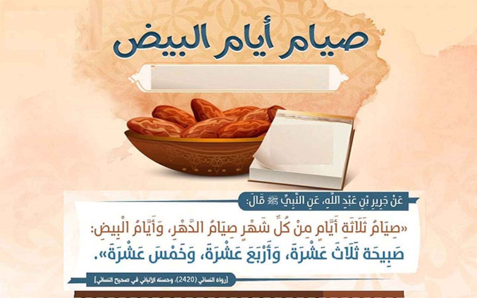 وعن عبد الله بن عمرو أن النبي صلى الله عليه وسلم قال: "صم من الشهر ثلاثة أيام، فإن الحسنة بعشر أمثالها، وذلك مثل صيام الدهر"، وسميت الأيام البيض بهذا الاسم صفة لبياض لياليها بالقمر، لأنه يطلع فيها من أولها إلى آخرها في طور البدر المكتمل المنير، ووفقا لجمهور أهلم العلم يتم تعيين موعد الأيام البيض بمعرفة بداية الشهر الهجري، ويثبت الشهر برؤية الهلال أو بإكمال الشهر السابق له ثلاثين يوما.