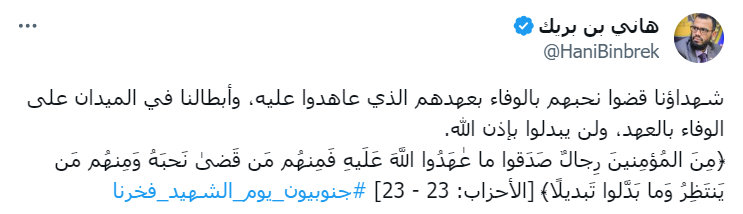 وحول يوم الشهيد بجنوب اليمن قال الشيخ هاني بن بريك نائب رئيس هيئة رئاسة المجلس الانتقالي الجنوبي باليمن: أن شهداؤنا قضوا نحبهم بالوفاء بعهدهم الذي عاهدوا عليه، وأبطالنا في الميدان على الوفاء بالعهد، ولن يبدلوا بإذن الله.