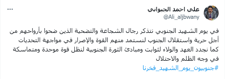 وأضاف عبر منصة أكس: نجدد العهد والولاء لثوابت ومبادئ الثورة الجنوبية لنظل قوة موحدة ومتماسكة في وجه الظلم والاحتلال.. #جنوبيون_يوم_الشهيد_فخرنا.