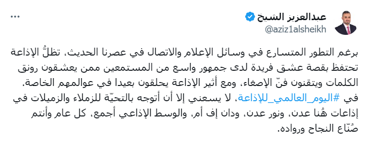 وأردف “ومع أثير الإذاعة يحلقون بعيدا في عوالمهم الخاصة”، متوجها في اليوم العالمي للإذاعة، بالتحيّة للزملاء والزميلات في إذاعات هُنا عدن، ونور عدن، ودان إف أم، والوسط الإذاعي أجمع”، مختتما”كل عام وأنتم صُنّاع النجاح ورواده”.