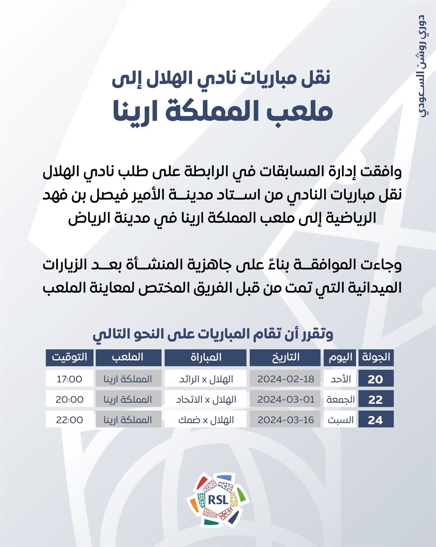 "وافقت إدارة المسابقات في الرابطة على طلب نادي الهلال، بنقل مباريات النادي من استاد مدينة الأمير فيصل بن فهد الرياضية، إلى ملعب المملكة ارينا في مدينة الرياض.