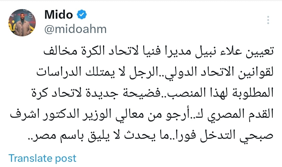 وكتب ميدو عبر حسابه الشخصي عبر منصة "إكس": "تعيين علاء نبيل مديرًا فنيًا لاتحاد الكرة مخالف لقوانين الاتحاد الدولي".