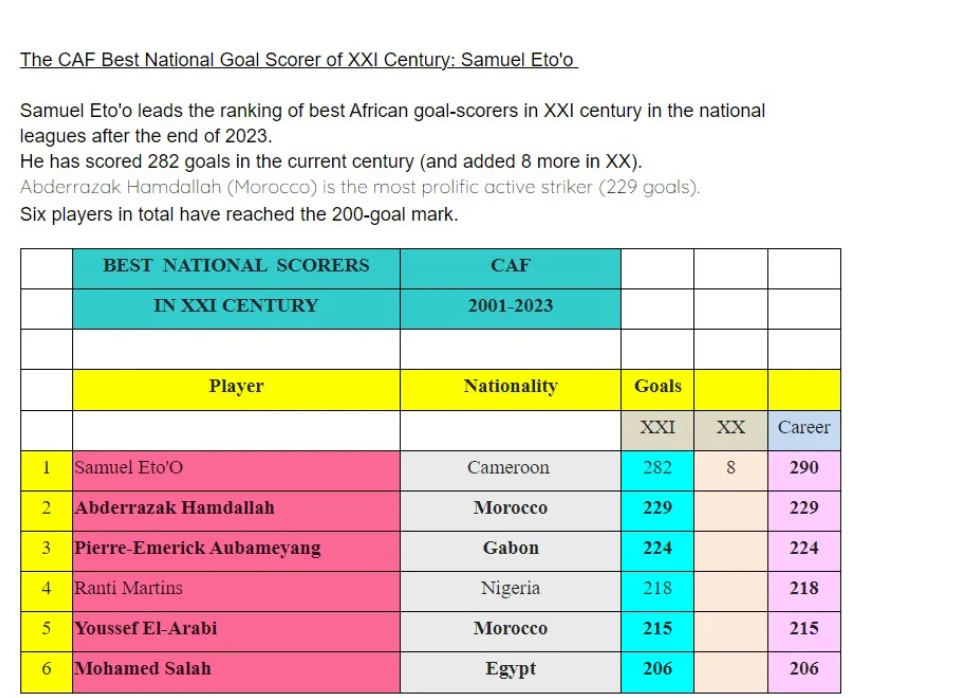 ونشر الموقع الرسمي الاتحاد الدولي لتأريخ وإحصاءات كرة القدم، قائمة اللاعبين الذين يتصدرهم صامويل إيتو ترتيب أفضل الهدافين الأفارقة في القرن الــ 21 في الدوريات الوطنية بعد نهاية عام 2023.