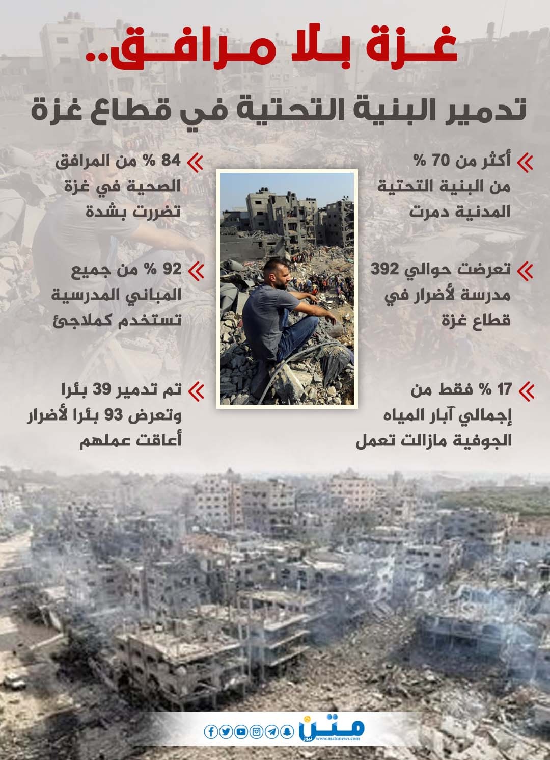 غزة بلا مرافق.. تدمير البنية التحتية في قطاع غزة (انفوجراف)