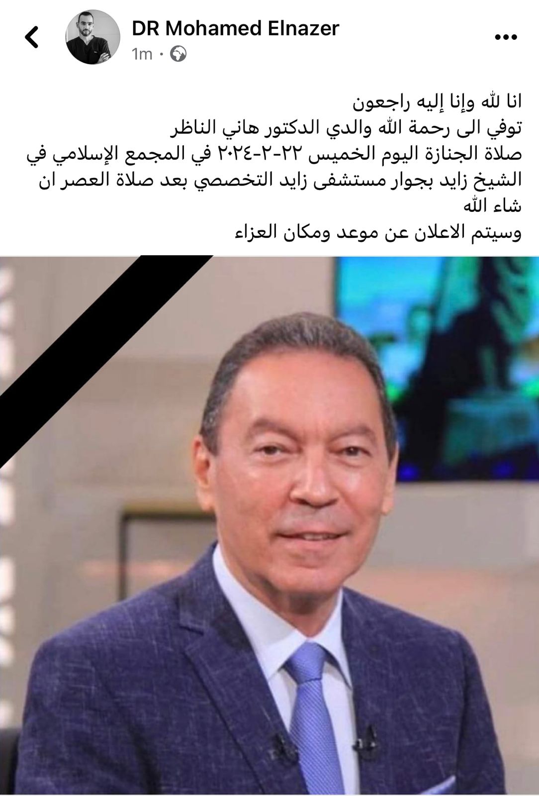 أعلن الدكتور المصري محمد الناظر، وفاة والده الدكتور هانى الناظر، وقال فى منشور عبر حسابه الرسمى بفيسبوك:"انا لله وإنا إليه راجعون، توفي إلى رحمة الله والدي الدكتور هاني الناظر، صلاة الجنازة اليوم الخميس ٢٢-٢-٢٠٢٤ في المجمع الإسلامي في الشيخ زايد بجوار مستشفى زايد التخصصي بعد صلاة العصر ان شاء الله، وسيتم الإعلان عن موعد ومكان العزاء".