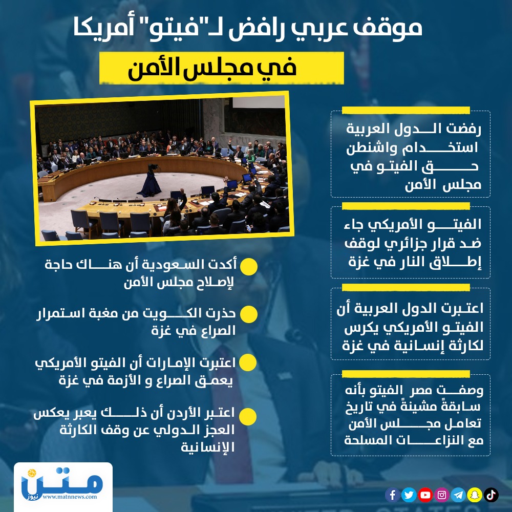 موقف عربي رافض لـ "فيتو" أمريكا في مجلس الأمن (إنفوجراف)