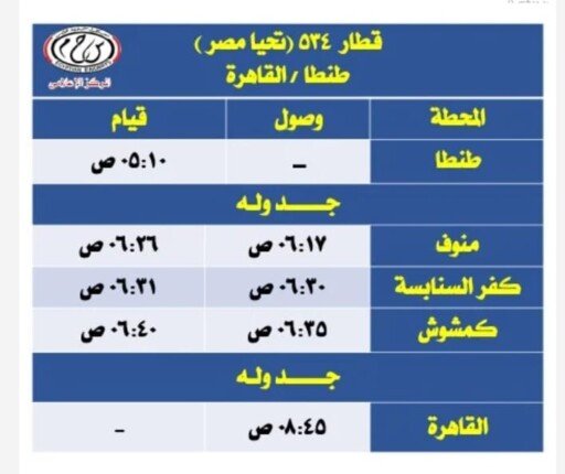 ويترتب على ما سبق تعديل جدول مسير قطار 534 طبقًا للجدول المرفق.