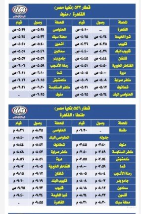 كما قررت الهيئة امتداد مسير قطار 556 ركاب طنطا / منوف لمحطة القاهرة، اعتبارًا من أمس الجمعة الموافق 23 / 2 / 2024، حيث يقوم من طنطا الساعة 6:30 مساء ويصل القاهرة الساعة 9:55 مساء طبقا للجدول المرفق.