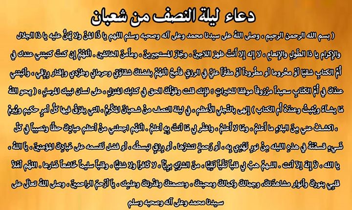 - اللهم إنا نسألك في صباح ليلة النصف من شعبان صباحا مبشرا، وهما منفرجا، ورزقا واسعا، ونعيما لا ينفد، اللهم زدنا نورا في الوجه، ومحبة في قلوب خلقك، واغفر لنا ولوالدينا ولمن له حق علينا، وصلّ اللهم على سيدنا محمد وعلى آله وصحبه أجمعين.