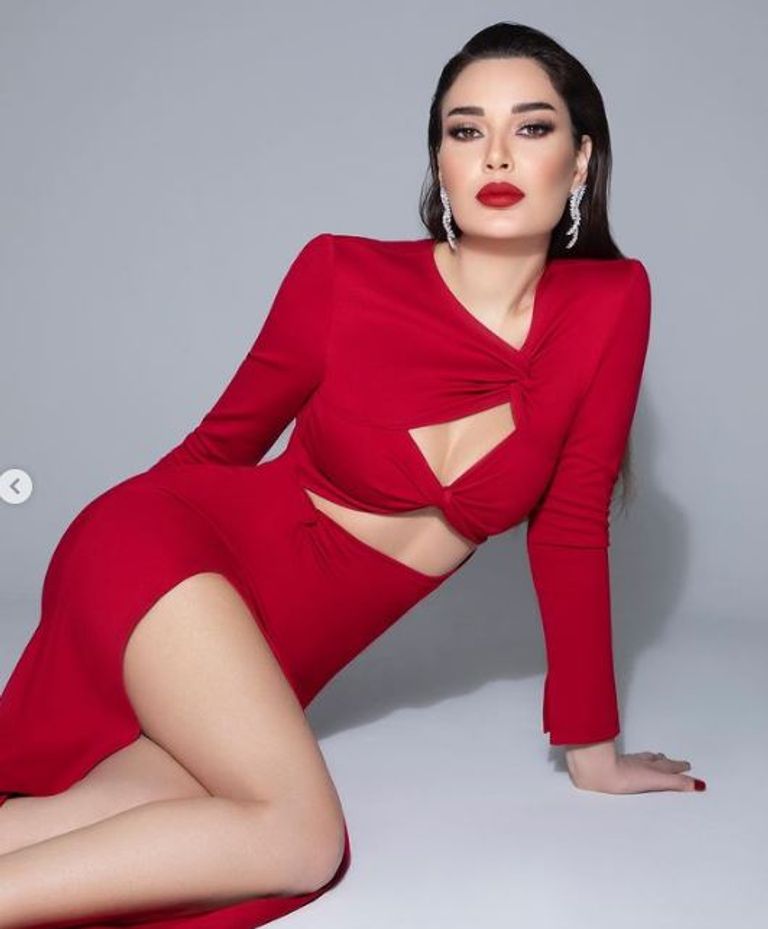 وظهرت الفنانة اللبنانية بفستان أحمر من توقيع ريّان بشارة، تميّز بفتحات في منطقة الصدر، الصيحة الرائجة في موضة 2024، إلى جانب شق واسع في منطقة البطن، مع شق جانبي مرتفع.