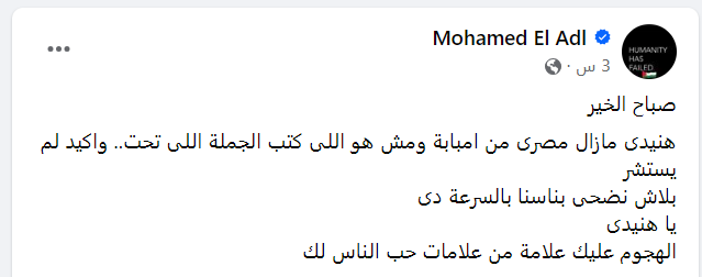 وكتب العدل عبر حسابه بموقع فيسبوك: هنيدى مازال مصري من إمبابة، ومش هو اللي كتب الجملة اللي تحت.
