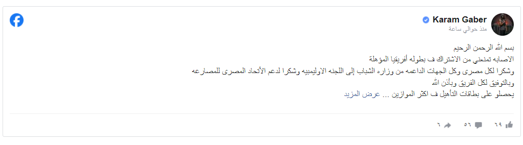 وكتب كرم جابر عبر صفحته الرسمية: "الإصابة تمنعني من الاشتراك في بطولة إفريقيا المؤهلة للأولمبياد".