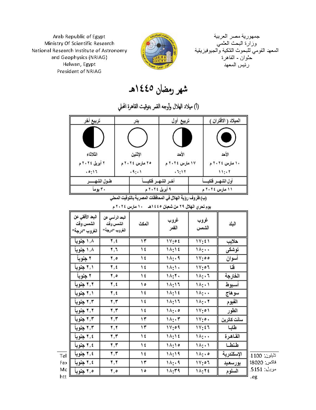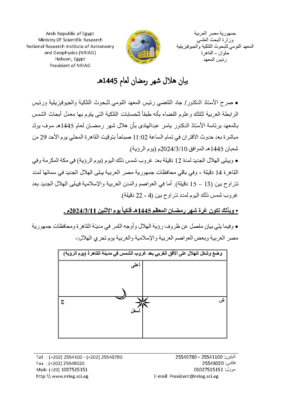 وأما موعد رمضان 2024 نوضح لكم تفاصيله وفقا للبيانات الصادرة عن معهد البحوث الفلكية والجيوفيزيقية كالتالي: