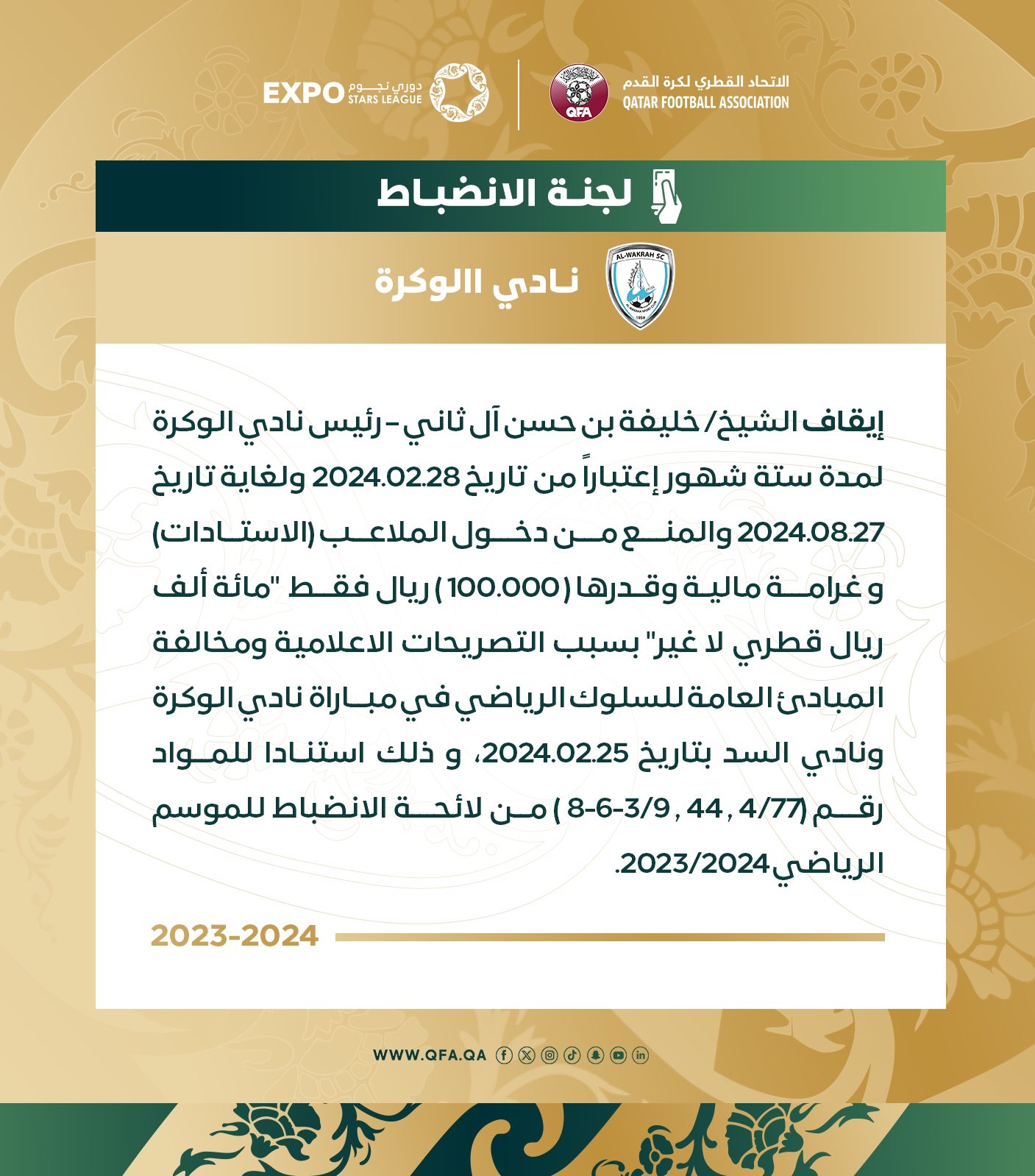 وأفاد الاتحاد القطري في بيان: "تم إيقاف خليفة بن حسن آل ثاني رئيس نادي الوكرة لمدة 6 أشهر بداية من تاريخ اليوم 28 فبراير 2024 وإلى غاية 27 أغسطس 2024 بالإضافة إلى غرامة مالية قدرها 100 ألف ريال قطري".