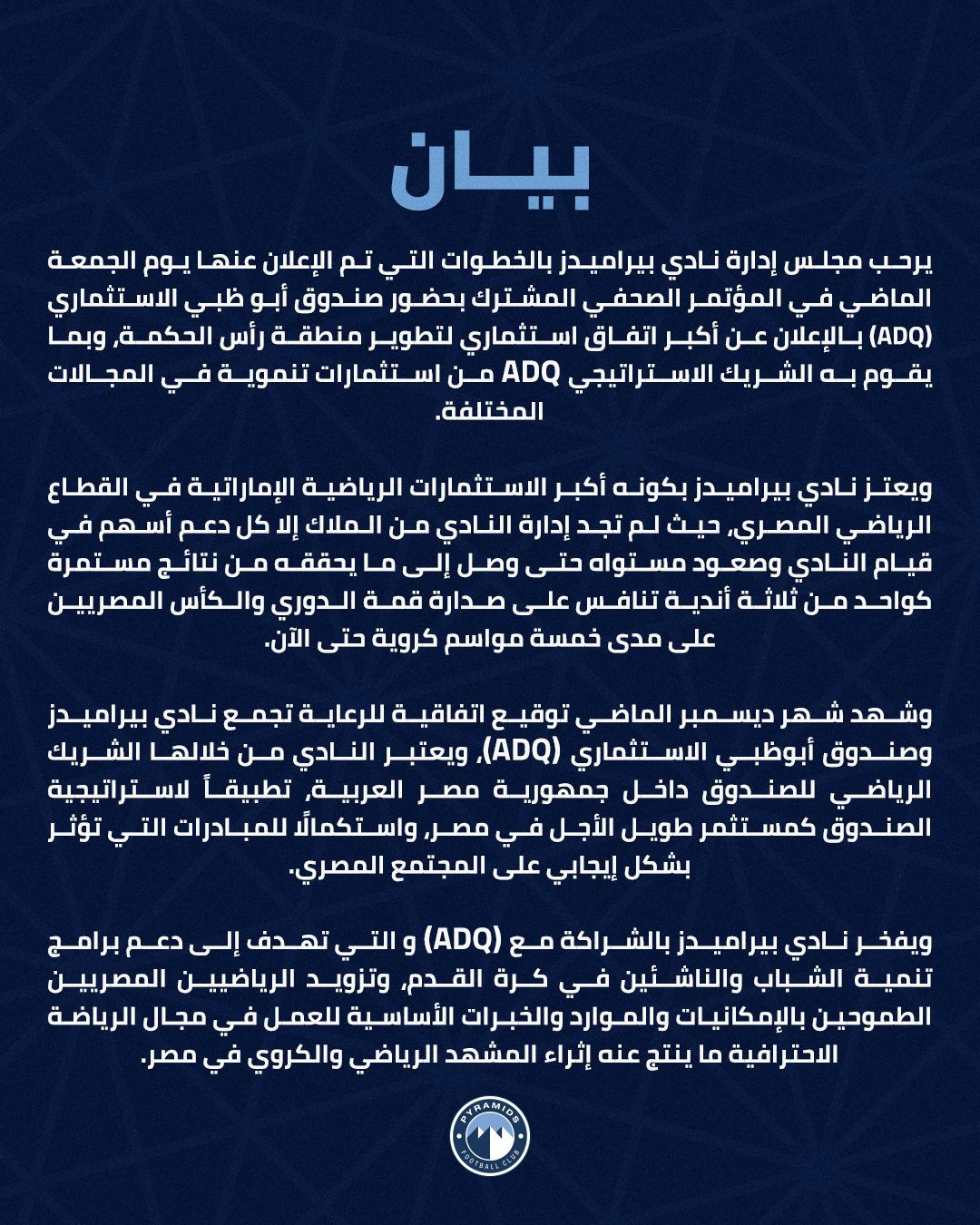 وأوضح البيان أن نادي بيراميدز يفخر بالشراكة مع (ADQ) والتي تهدف إلى دعم برامج تنمية الشباب والناشئين في كرة القدم، وتزويد الرياضيين المصريين الطموحين بالإمكانيات والموارد والخبرات الأساسية للعمل في مجال الرياضة الاحترافية ما ينتج عنه إثراء المشهد الرياضي والكروي في مصر.