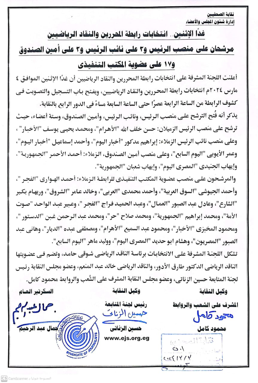 يذكر أنه فُتح الترشح على منصب الرئيس، ونائب الرئيس، وأمين الصندوق، وستة أعضاء، حيث ترشح على منصب الرئيس الزميلان: حسن خلف الله "الأهرام"، ومحمد يحيى يوسف "الأخبار"، وعلى منصب نائب الرئيس الزملاء: إبراهيم مدكور "أخبار اليوم"، وأحمد إسماعيل "أخبار اليوم"، وعمر الأيوبى "اليوم السابع"، وعلى منصب أمين الصندوق، الزملاء: أحمد الأحمر "الجمهورية"، وإيهاب الجنيدى "المصرى اليوم"، وإيهاب شعبان "الجمهورية".
