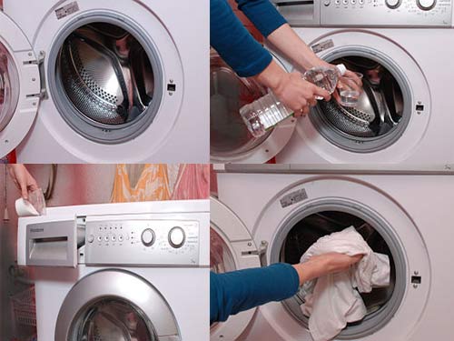 - ضعي 500 مل من الخل الأبيض في حوض الغسالة واتركيها تمتلئ بالماء.