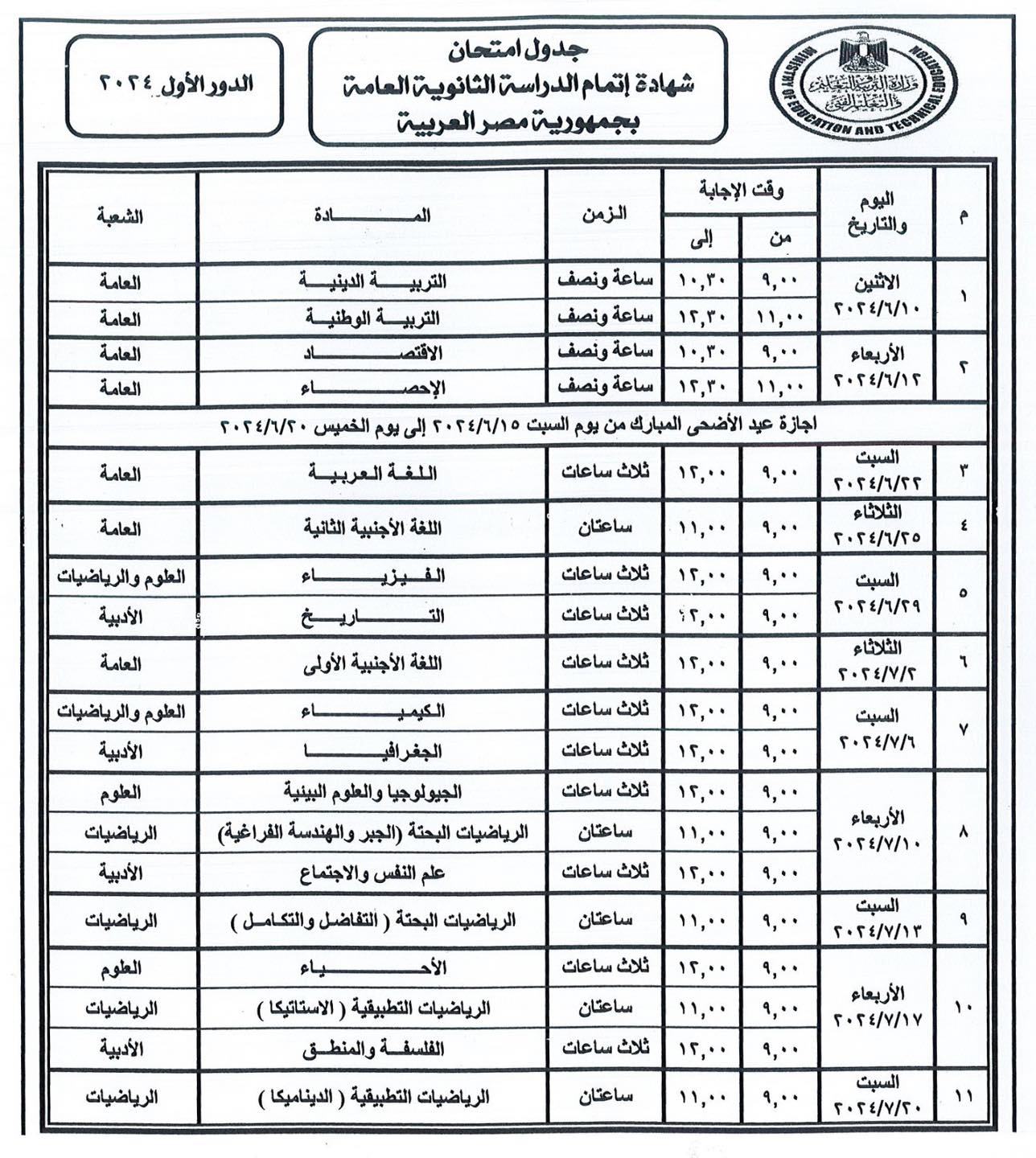جدول امتحانات الثانوية العامة 2024 علمي علوم