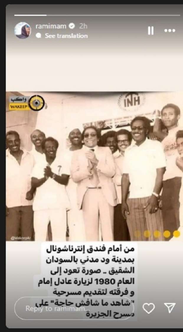 ونشر رامي إمام الصورة عبر خاصية الإستوري على موقع الصور والفيديوهات «إنستجرام»، وعلق قائلا: من أمام فندق إنترناشونال بمدينة ود مدني بالسودان الشقيق.. صورة تعود إلى العام 1980 لزيارة عادل إمام وفرقته لتقديم مسرحية شاهد ما شافش حاجة على مسرح الجزيرة.