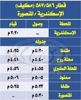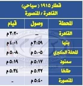 - تعديل ميعاد قيام قطار 1915 سياحي القاهرة / المنصورة ليقوم من محطة القاهرة الساعة 3:20 مساءًا بدلًا من الساعة 5:10 مساءًا ليصل محطة المنصورة الساعة 5:40 مساءًا طبقًا للجدول المرفق.