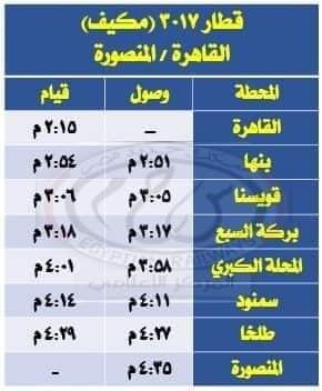 كما تقرر وقوف قطار رقم 3017 ثالثة مكيفة خط القاهرة - المنصورة بمحطتي قويسنا وبركة السبع طبقًا للجدول المرفق .