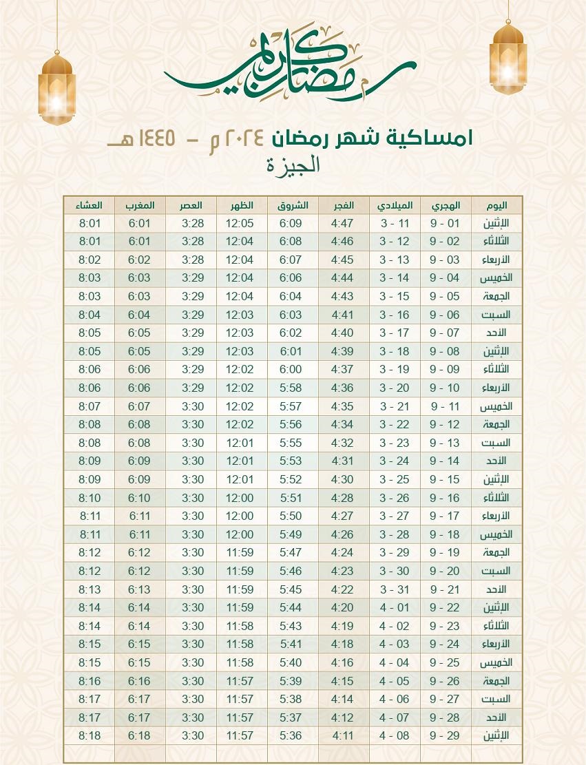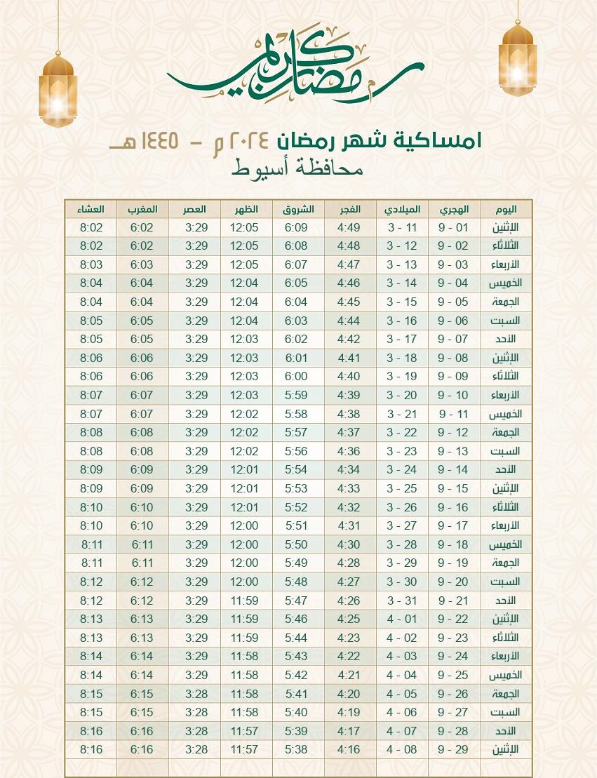 وبالحديث عن موعد سحور أول يوم رمضان 2024، فلا بد من التنويه كذلك بموعد أذان الفجر البذي يبدأ معه الصيام، حيث يحين أذان الفجر في محافظة الجيزة الساعة 4:44 صباحا، وفي القاهرة الساعة 4:43 صباحا، وفي الإسكندرية يحين موعد أذان الفجر الساعة 4:47 صباحا، وفي الإسماعيلية الساعة 4:38 صباحا، ويمكنكم الاطلاع على إمساكية رمضان من هنـــــــــــــا.