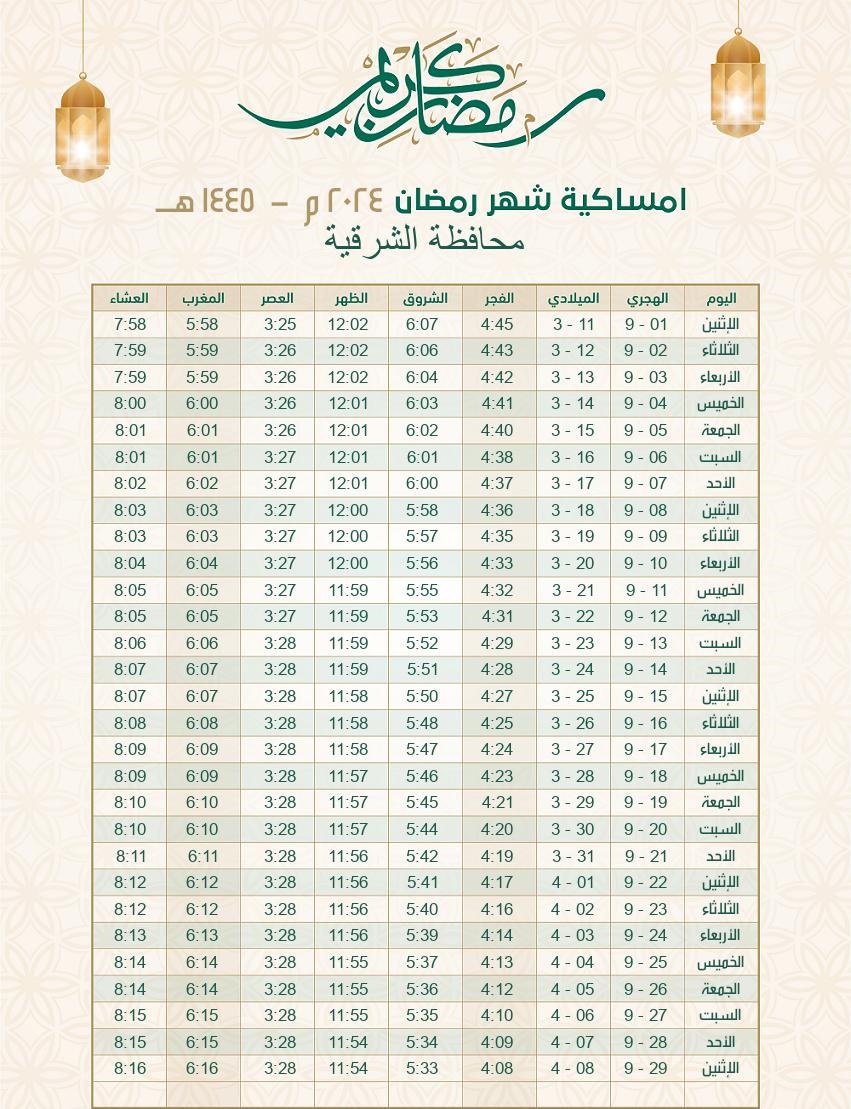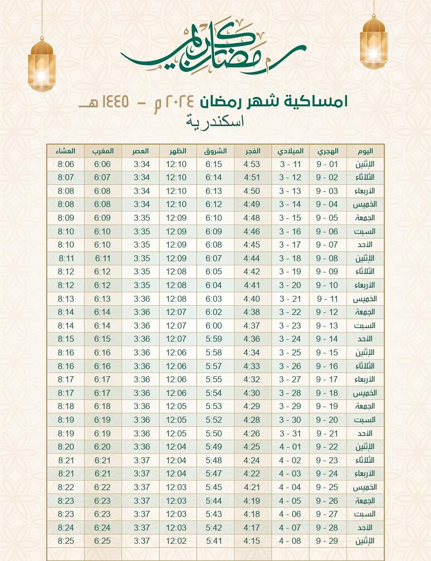 وأما موعد سحور أول يوم رمضان 2024 وفقا لـ إمساكية شهر رمضان في مصر، نوضحها لكم، حيث يتزامن موعد أول يوم رمضان بناء على الحسابات الفلكية، يوم الإثنين 11/3/2024، مع العلم أن موعد السحور المذكور في الإمساكية هو وقت تقديري لما قبل أذان الفجر، ويتواجد في الإمساكية بموعد 2:23 صباحا في القاهرة والجيزة وأغلب المحافظات المصرية.
