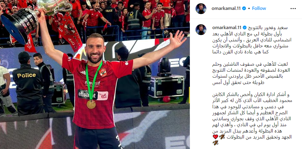 وكتب عمر كمال عبد الواحد عبر حسابه الشخصي على موقع "إنستجرام": "سعيد وفخور بالتتويج بأول بطولة لي مع النادي الأهلي بعد انضمامي للنادي العريق، وأتمنى أن يكون مشواري معه حافل بالبطولات والإنجازات كما هي عادة نادي القرن دائمًا".