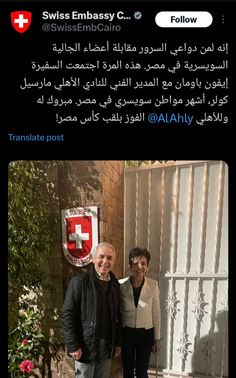 وأضافت: "هذه المرة اجتمعت السفيرة إيفون باومان مع المدير الفني للنادي الأهلي مارسيل كولر، أشهر مواطن سويسري في مصر، مبروك له وللأهلي الفوز بلقب كأس مصر".